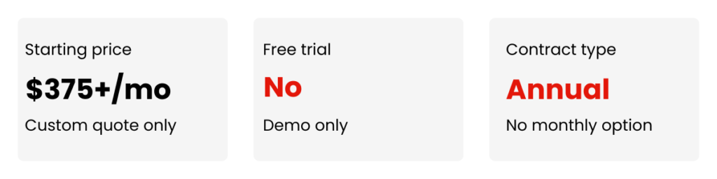 | Enterprise ($100M+) | Custom, often $100,000+ per year | Annual contract required |